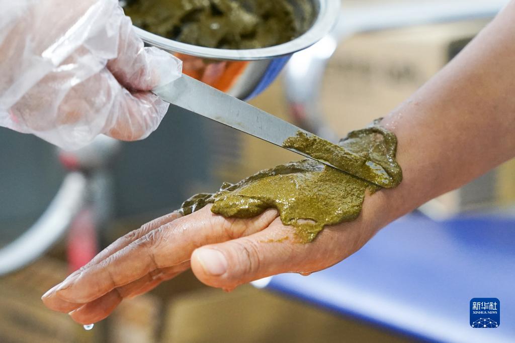 11月8日,在安徽省祁門(mén)蛇傷研究所,工作人員為蛇傷患者涂抹“祛瘀散”。