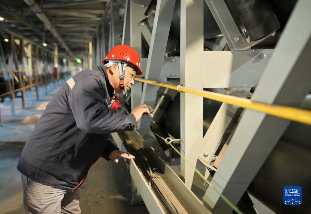 11月12日,工人在唐山海港經(jīng)濟開(kāi)發(fā)區管帶機廊道查看運行狀態(tài)。