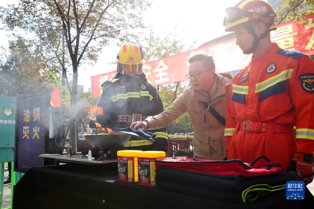 11月13日,市民(中)在消防員指導下進(jìn)行廚房油鍋滅火體驗。