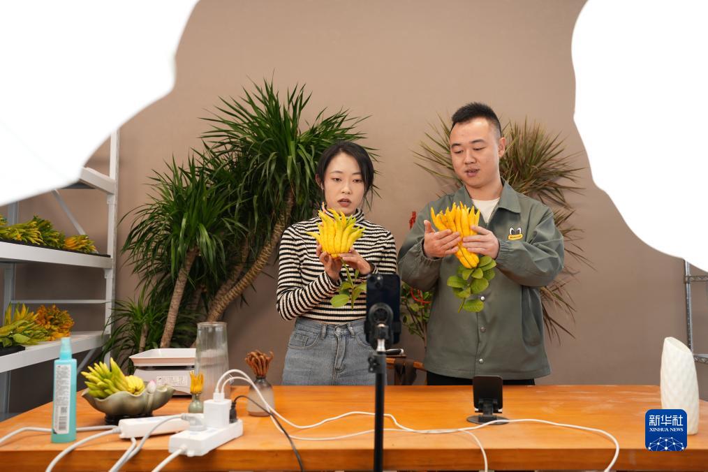 11月13日,在金華市婺城區羅店鎮金佛手果園共富工坊,工作人員在直播推銷(xiāo)佛手。