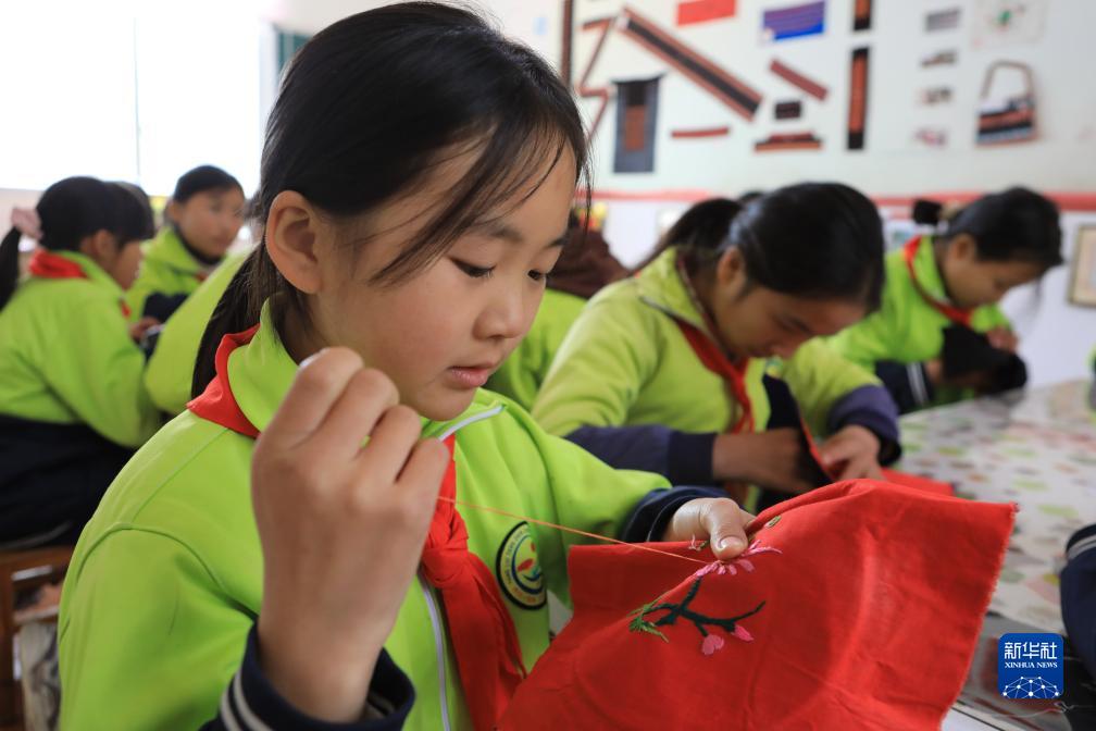 11月13日,在貴州省黔東南苗族侗族自治州施秉縣楊柳塘鎮中心小學(xué),學(xué)生在苗繡課堂學(xué)習刺繡。