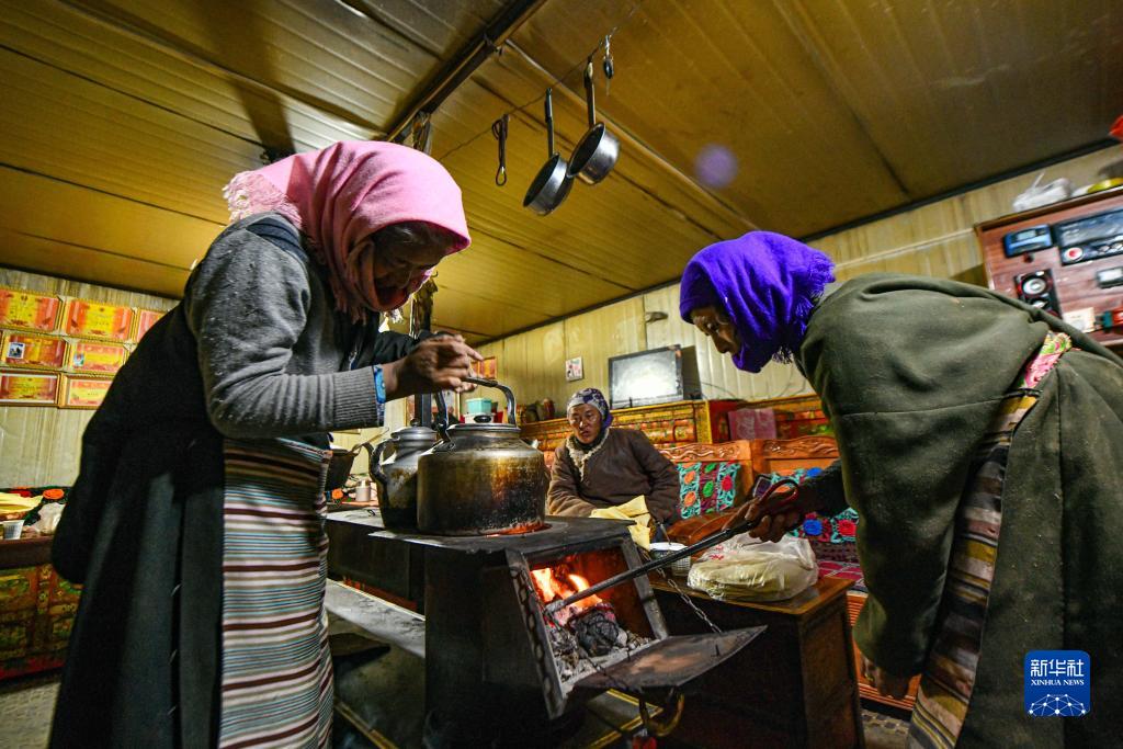 在西藏當雄縣納木湖鄉達布村的冬季放牧點(diǎn),云丹的妻子同吉(右)和朋友芝嘎措姆在燒水(11月10日攝)。