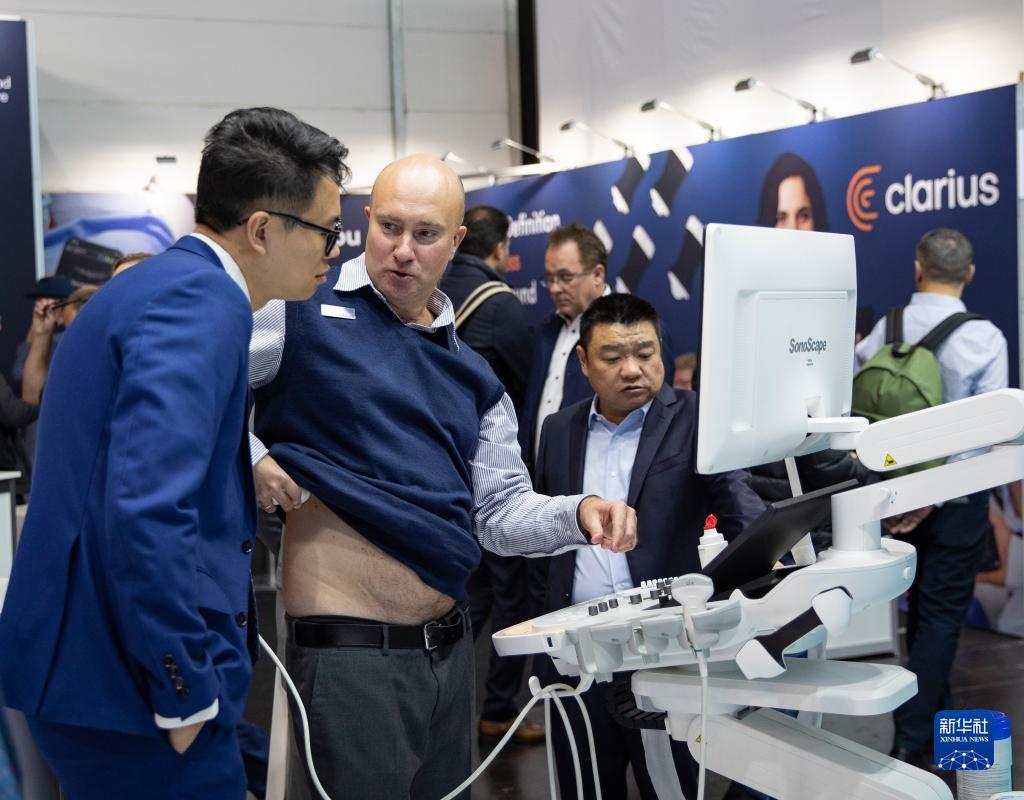11月13日,在德國杜塞爾多夫國際醫療器械設備展,參觀(guān)者在開(kāi)立醫療展位體驗超聲設備。新華社記者 張帆 攝