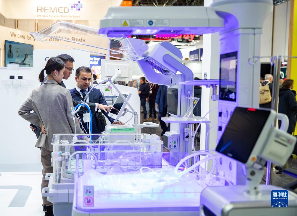 11月13日,在德國杜塞爾多夫國際醫療器械設備展,參觀(guān)者在科曼醫療展位咨詢(xún)洽談。新華社記者 張帆 攝