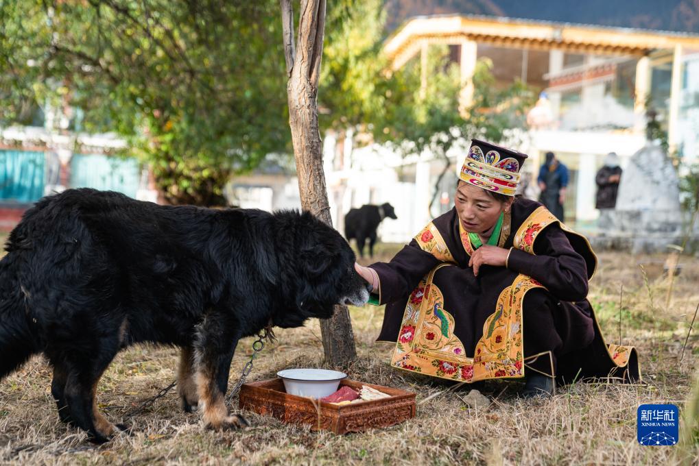 工布新年的大年初一,拉巴卓瑪按照習俗“請狗赴宴”,為家里的狗端來(lái)了新鮮牛肉、糌粑和牛奶(11月14日攝)。