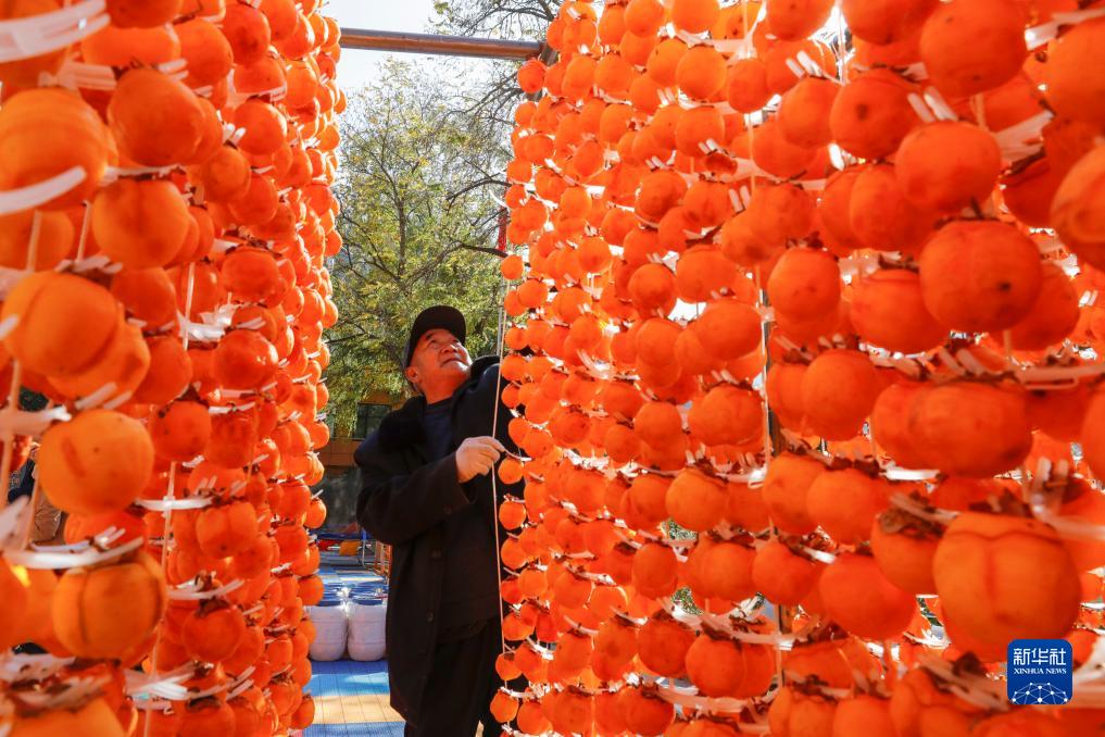 11月14日,在甘肅省甘南藏族自治州舟曲縣立節鎮杰迪村,村民在晾曬柿子。