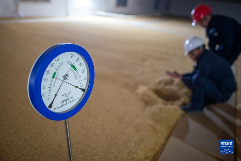 11月14日,在中儲糧仙桃直屬庫有限公司,工作人員在倉房?jì)妊惨暀z查。