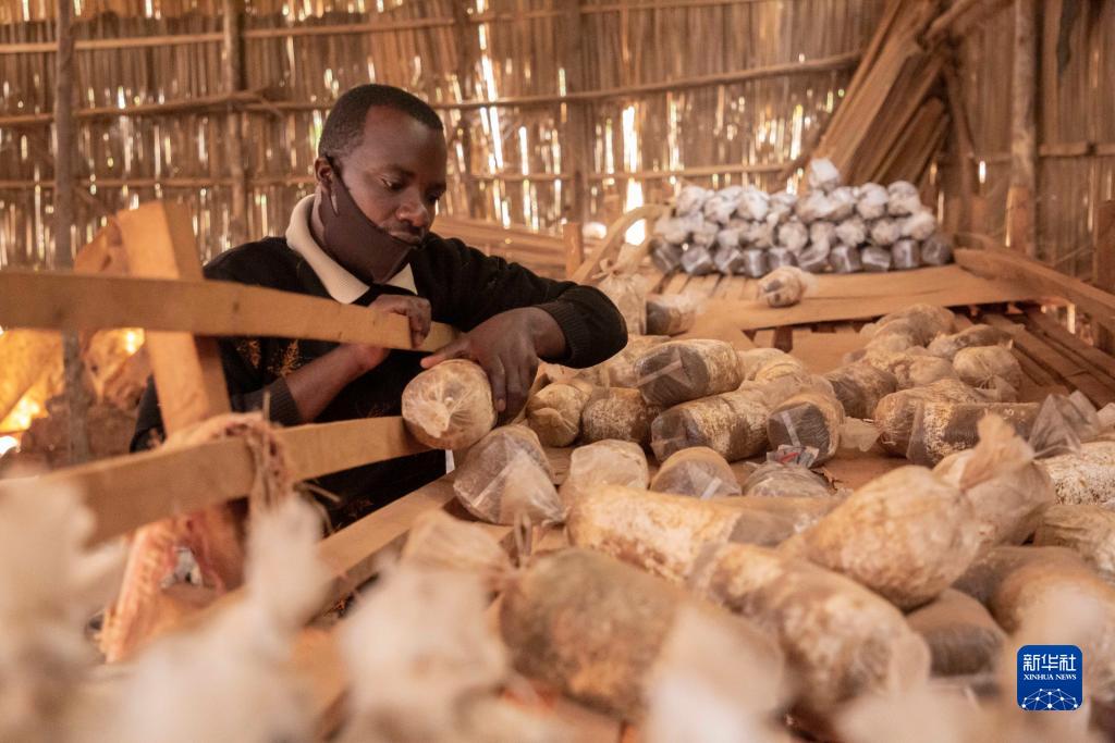 在盧旺達首都基加利的一家食用菌培育作坊,作坊主人埃馬紐埃爾·阿希馬納檢查菌袋(2020年9月9日)。中國福建農林大學(xué)的菌草專(zhuān)家2006年來(lái)到盧旺達開(kāi)始菌草技術(shù)合作項目,在當地示范和推廣菌草技術(shù)。