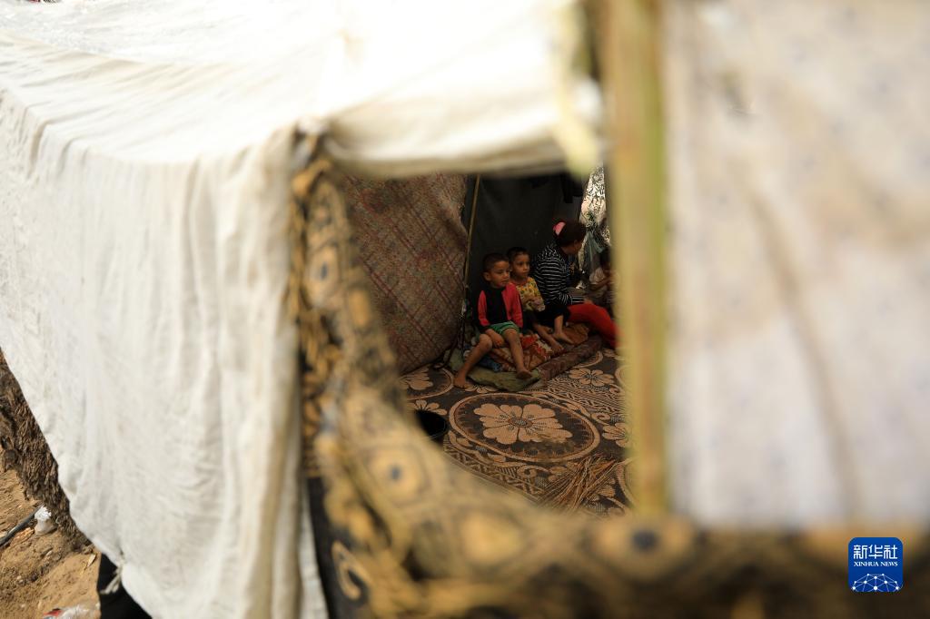 這是11月14日在加沙地帶南部城市汗尤尼斯一個(gè)臨時(shí)營(yíng)地拍攝的流離失所的巴勒斯坦人。
