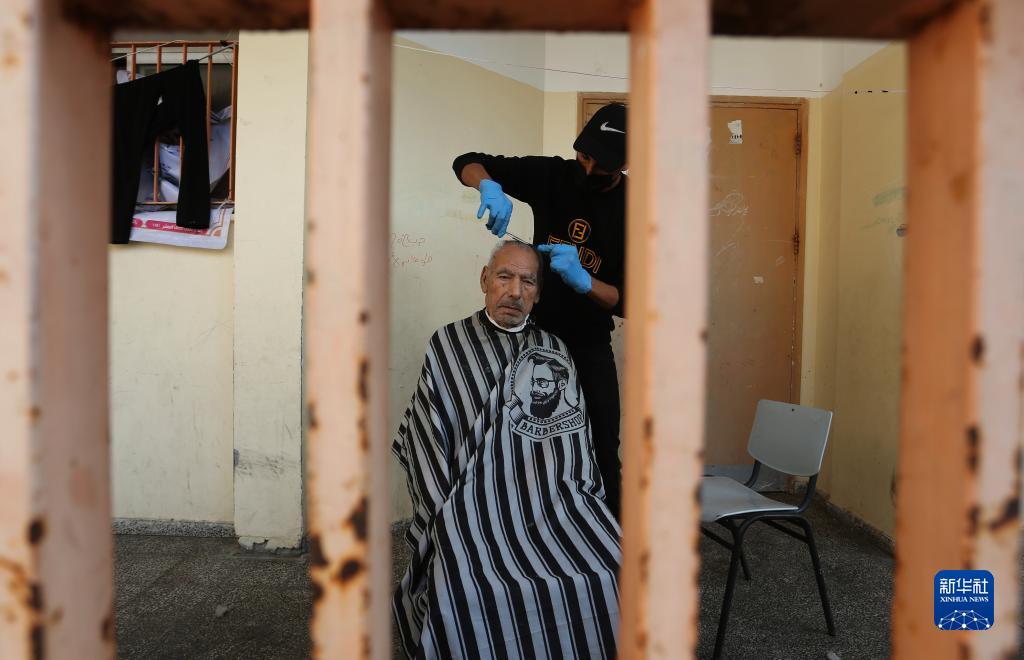 11月14日,在加沙地帶南部城市拉法,志愿者為流離失所的巴勒斯坦人理發(fā)。