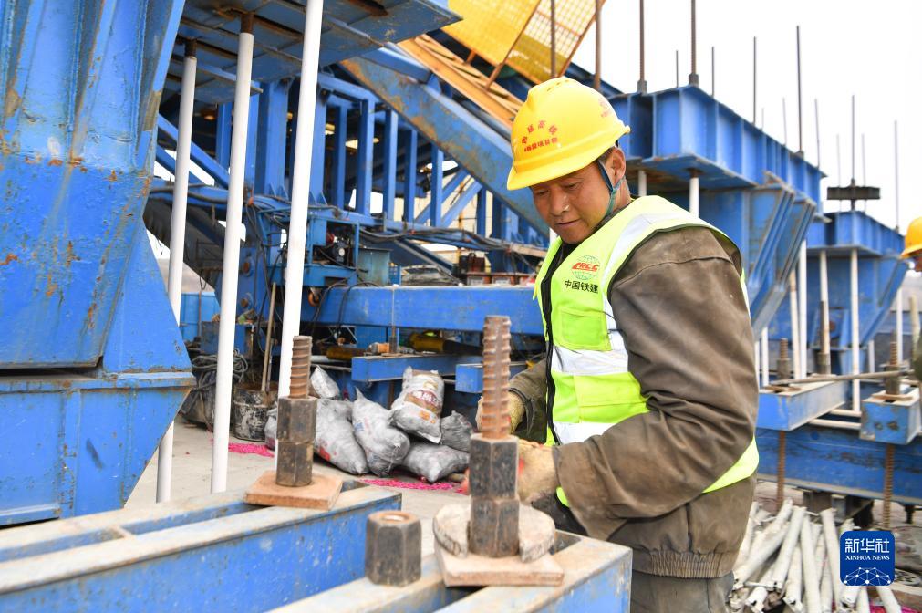 11月15日,中國鐵建大橋工程局工人在西延高鐵王家河特大橋施工。