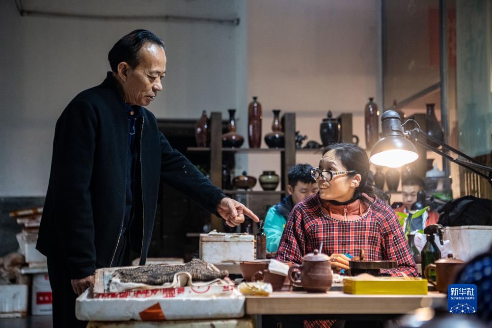 11月14日,梁先才在鴉嶼陶藝工作室內指導手藝人制陶。