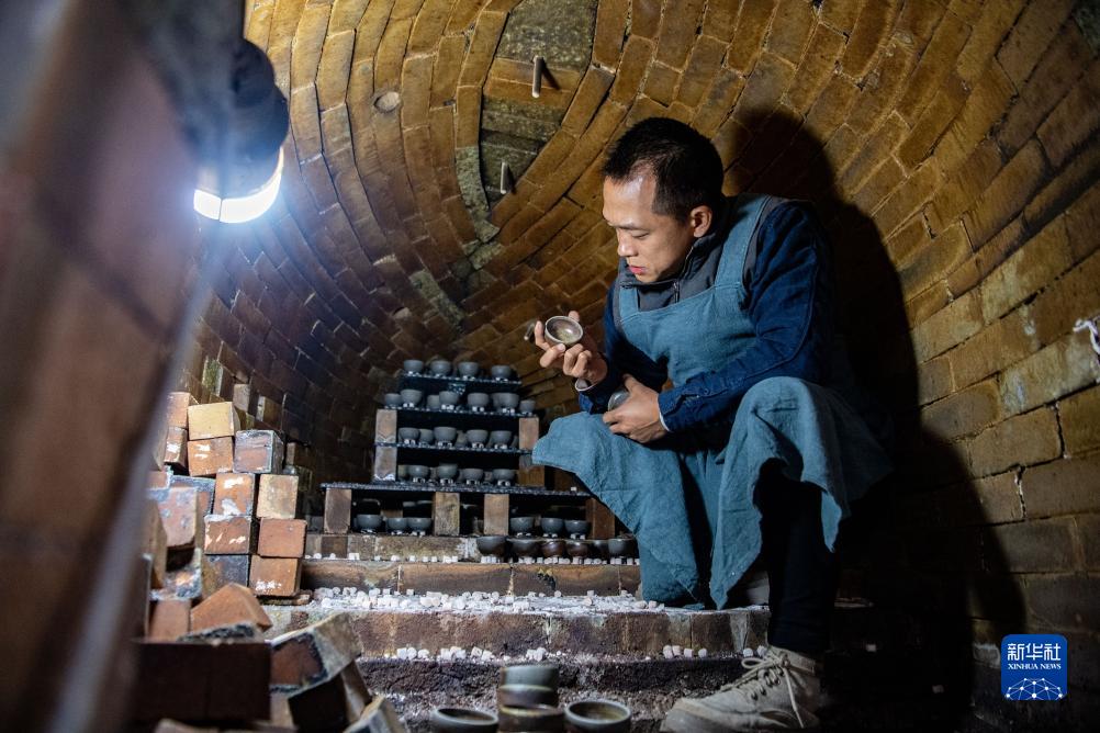 11月14日,管永雙在窯內查看陶器的燒制情況。