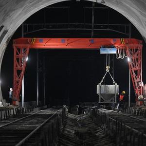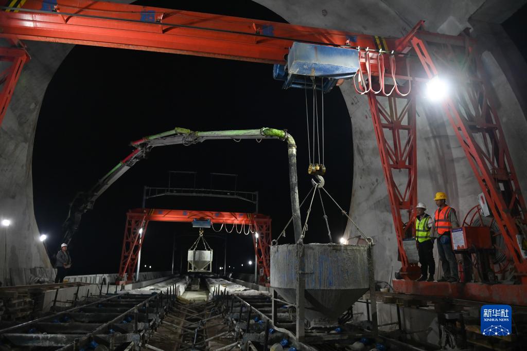 11月15日晚,中鐵十一局的建設者在杭衢鐵路(建衢段)天池山隧道無(wú)砟軌道澆筑施工現場(chǎng)作業(yè)。