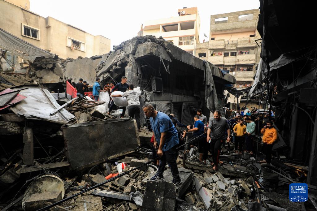 11月15日,在加沙地帶南部城市汗尤尼斯,人們查看遭以色列空襲后的建筑廢墟。