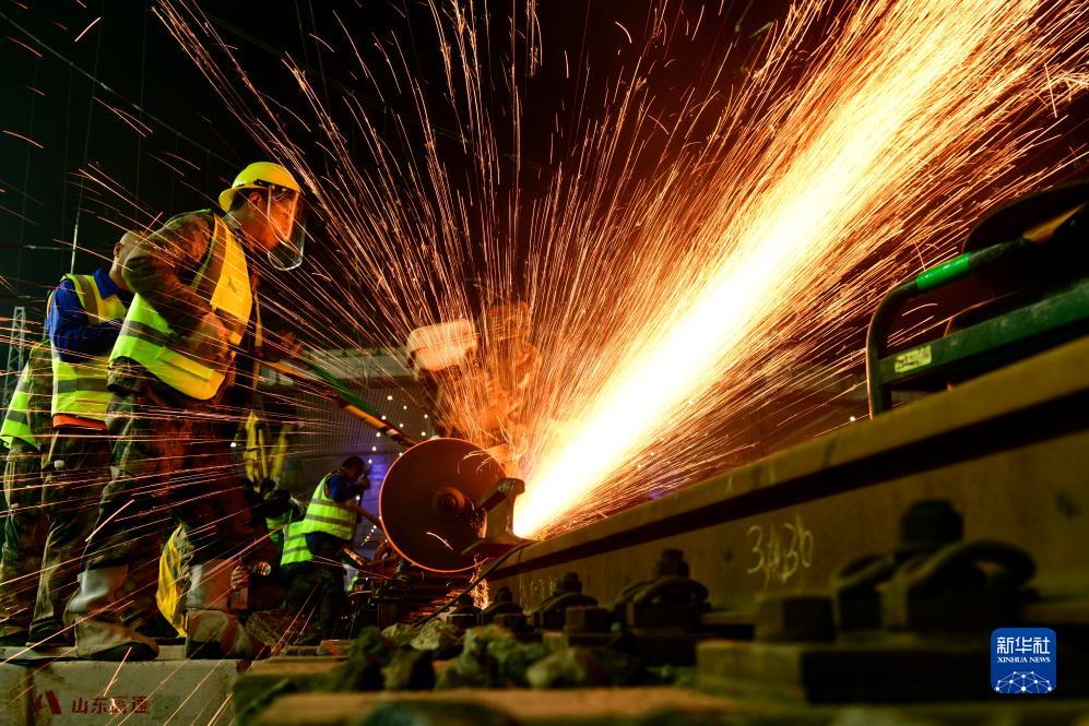 11月15日夜間,在濟南火車(chē)站,中鐵十局的工作人員正在對濟鄭高鐵引入濟南站進(jìn)行站改作業(yè)。