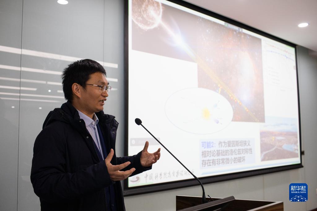 11月14日,在中國科學(xué)院高能物理研究所,文章通訊作者、中國科學(xué)院高能物理研究所研究員陳松戰在介紹研究成果。
