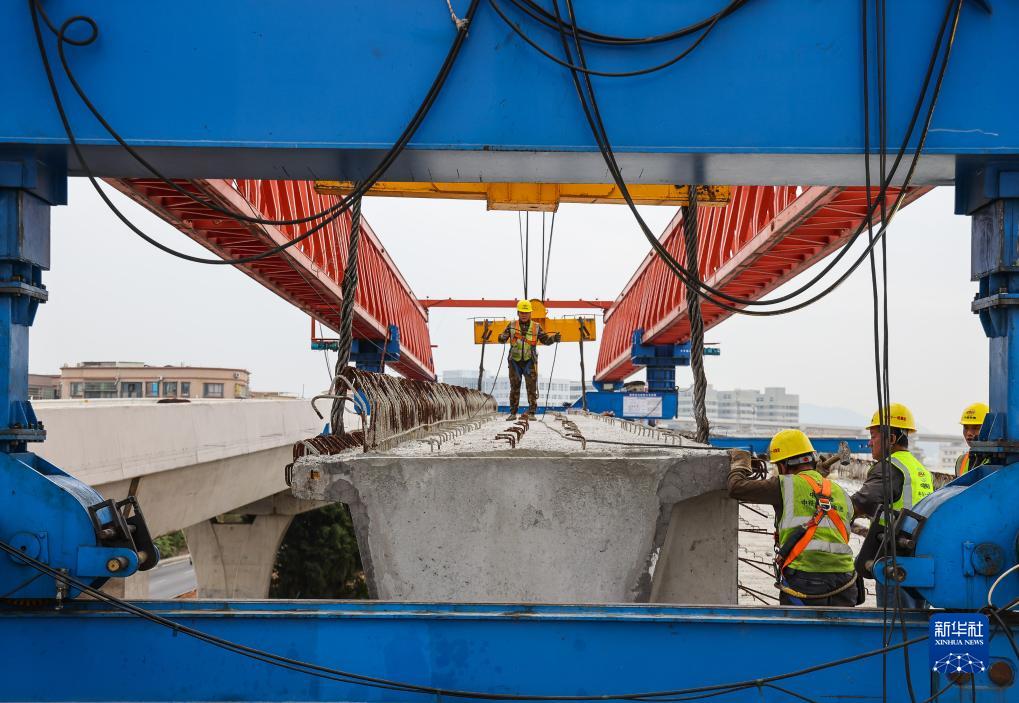 11月16日,建設者在吊裝中山坦神北路主線(xiàn)最后一片混凝土箱梁。