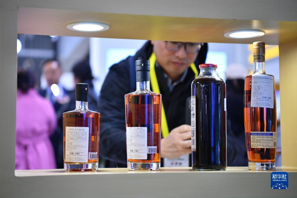 11月16日,觀(guān)眾在第七屆絲博會(huì )上參觀(guān)阿塞拜疆展位上的酒水產(chǎn)品。
