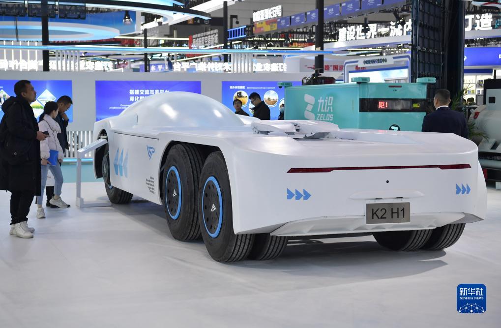 11月16日,觀(guān)眾在第七屆絲博會(huì )上參觀(guān)一款電動(dòng)重卡滑板底盤(pán)。