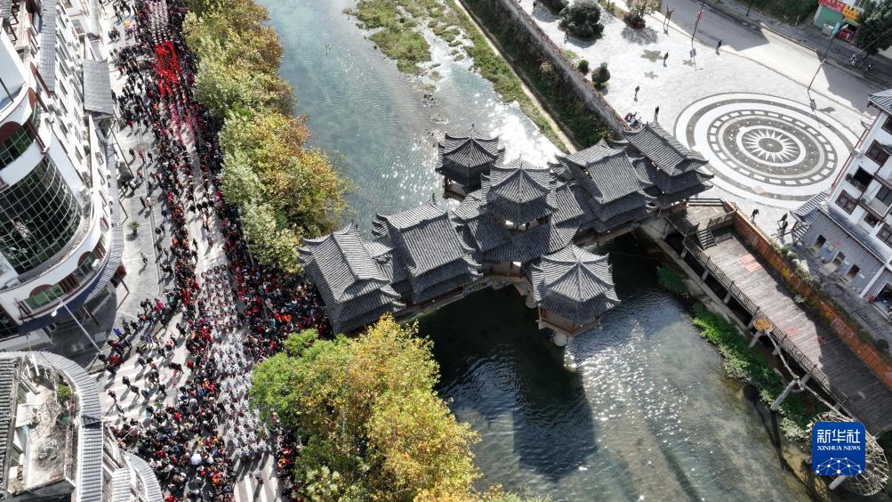 11月16日,在雷山縣縣城,苗族群眾身著(zhù)盛裝,載歌載舞參加苗年和鼓藏節的巡游活動(dòng)(無(wú)人機照片)。