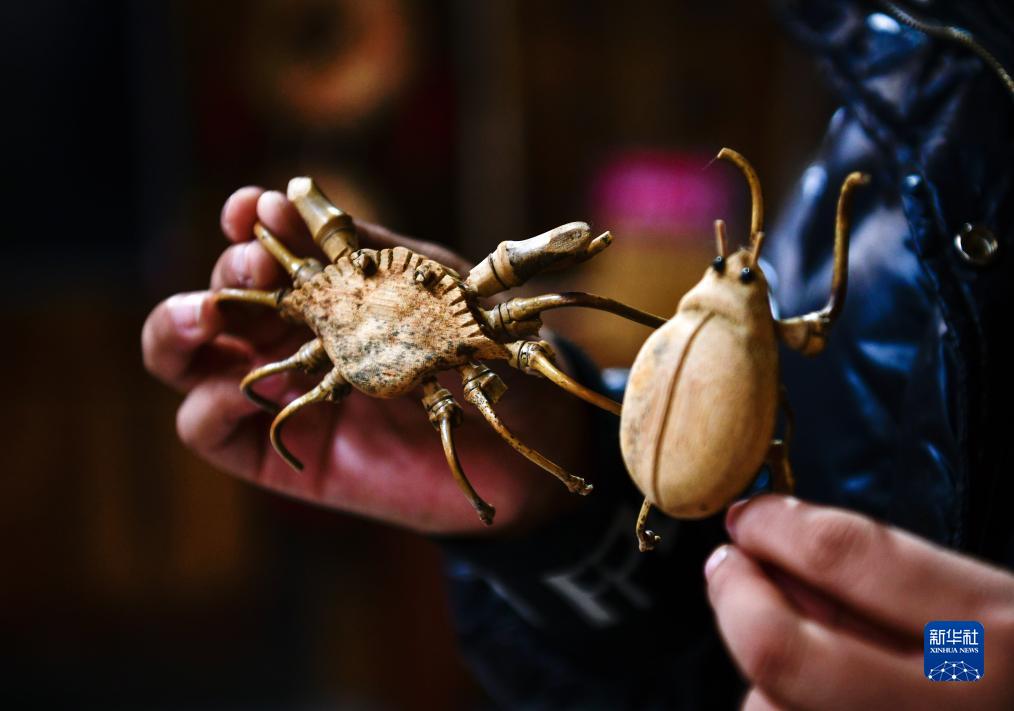 11月15日,幫扶干部在貴州省石阡縣國榮鄉樓上古寨的文創(chuàng )工坊里展示竹雕工藝品。