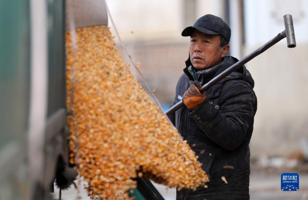 11月16日,工人在遼寧省臺安縣桓洞鎮的一家糧庫內卸載玉米。