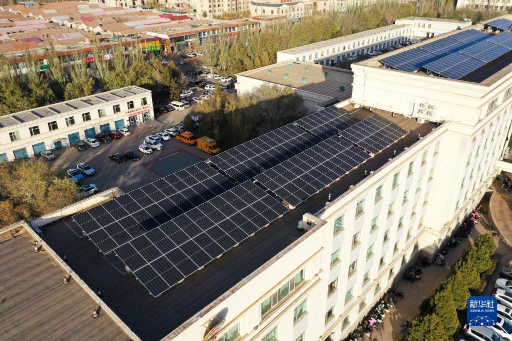 這是11月16日拍攝的海勃灣區人民政府大樓屋頂的光伏板(無(wú)人機照片)。