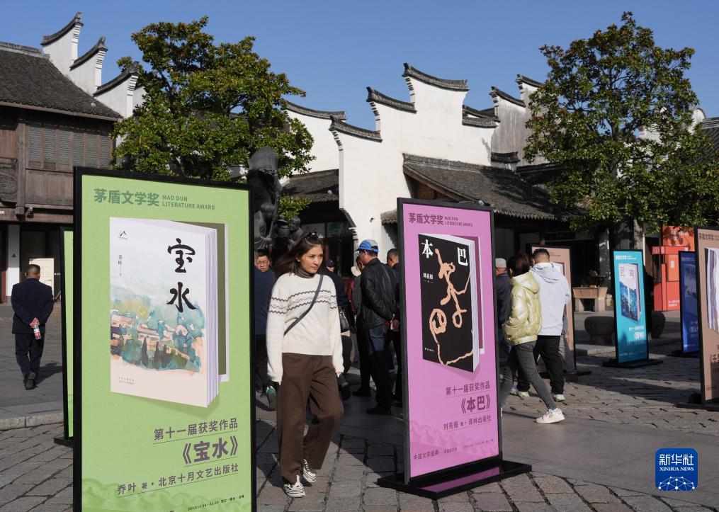 11月17日,人們從烏鎮景區展示的茅盾文學(xué)獎獲獎作品展板旁走過(guò)。