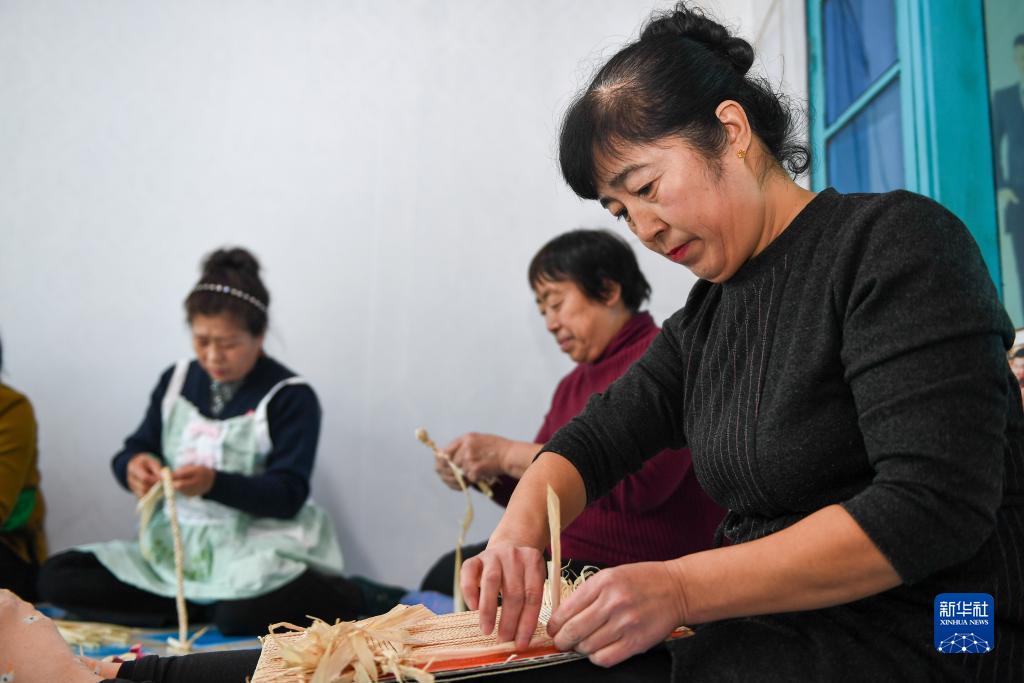 11月16日,在長(cháng)春市九臺區龍嘉巧姐草編農民專(zhuān)業(yè)合作社,閆金鳳(右)帶領(lǐng)社員制作草編工藝品。