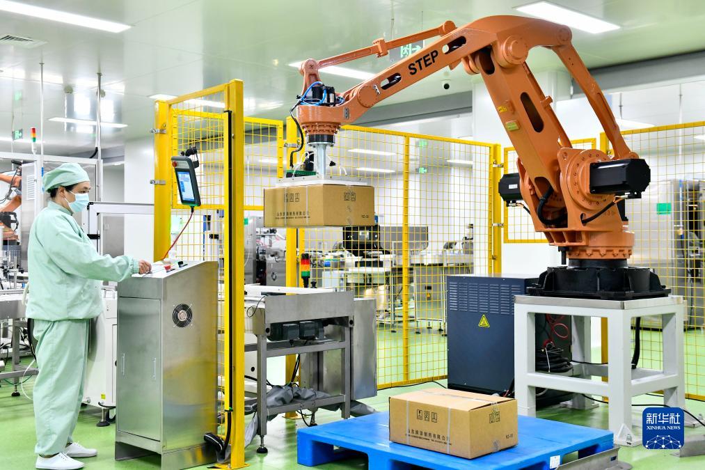 7月7日,在菏澤了未元生物醫藥大健康產(chǎn)業(yè)園,工業(yè)機器人從生產(chǎn)線(xiàn)上搬運成品藥箱。