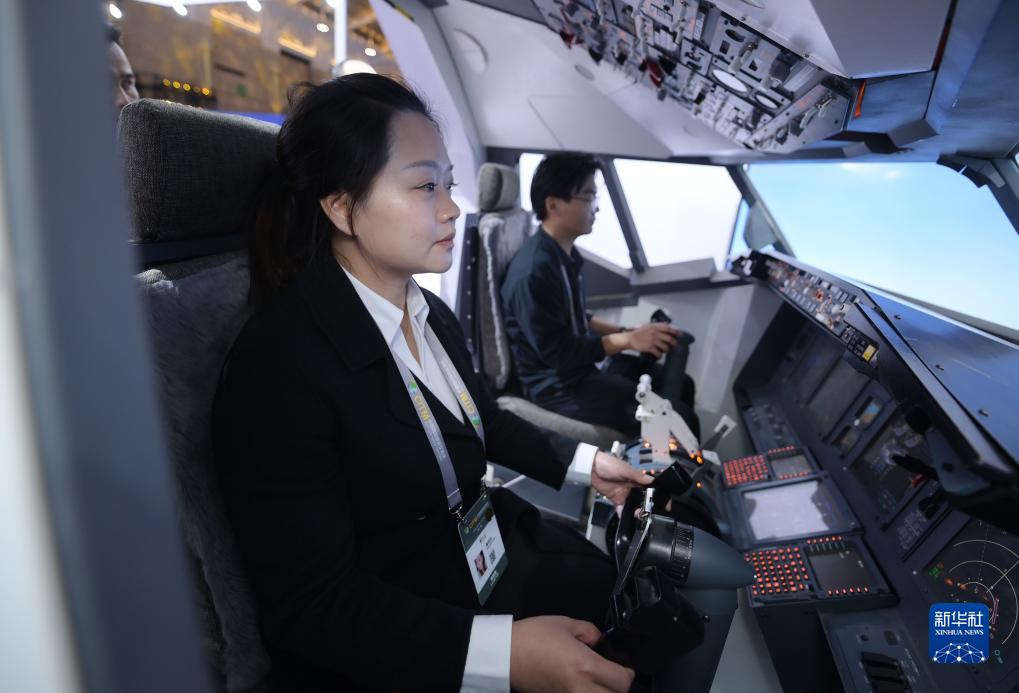 11月17日,觀(guān)眾在2023中國國際旅游交易會(huì )中國國際航空公司展臺內的飛行模擬艙體驗駕駛。