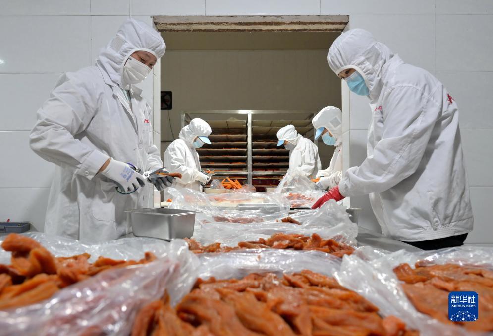 11月17日,河北省灤南縣安各莊鎮一家食品公司的工人在紅薯條分揀車(chē)間工作。