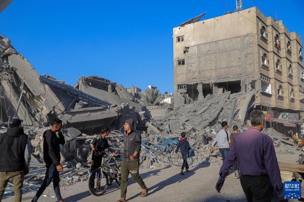 11月17日,在加沙地帶南部城市汗尤尼斯,人們走過(guò)遭以色列襲擊后的建筑廢墟。