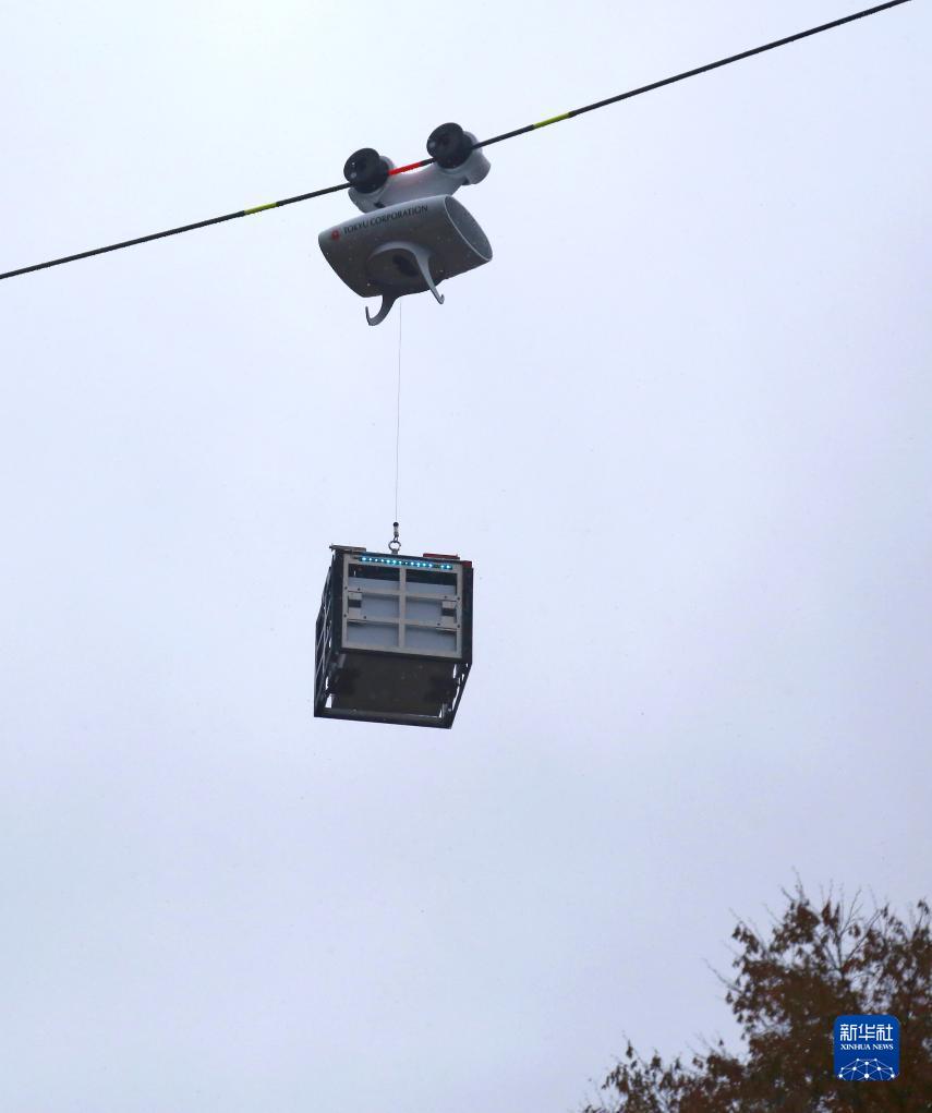 11月17日,在日本川崎市,空中索道機器人在面向媒體的試驗說(shuō)明會(huì )上演示投遞商品。