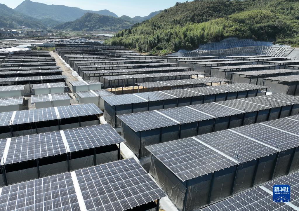 這是在福建省古田縣杉洋鎮拍攝的棚下種菇、棚上發(fā)電的光伏菇棚基地一角(11月17日攝,無(wú)人機照片)。