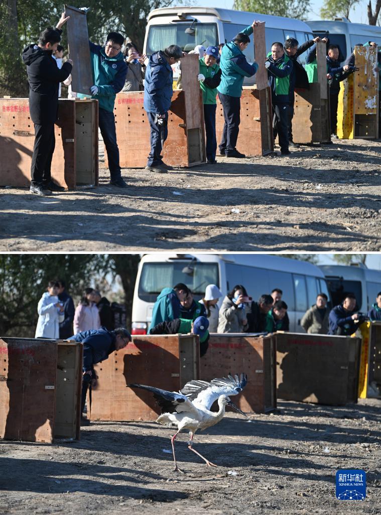 11月18日,工作人員打開(kāi)木門(mén)將東方白鸛放歸自然(拼版照片)。