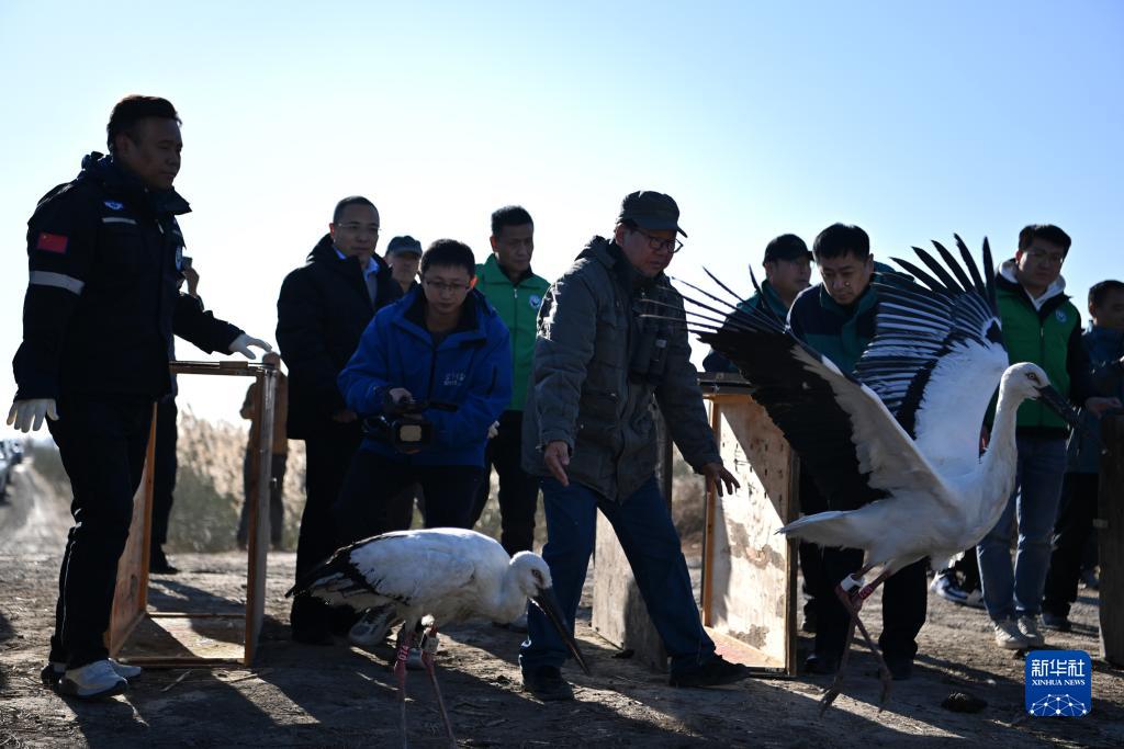 11月18日,工作人員打開(kāi)木門(mén)將東方白鸛放歸自然。