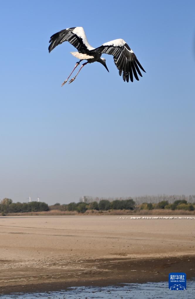 11月18日,一只被救助的東方白鸛向鳥(niǎo)群飛去。