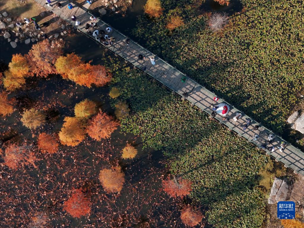 11月18日,游客在山東省煙臺市牟平區魚(yú)鳥(niǎo)河濕地公園游玩(無(wú)人機照片)。