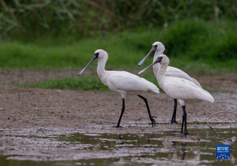 三只國家一級重點(diǎn)保護野生動(dòng)物黑臉琵鷺在福州長(cháng)樂(lè )閩江河口濕地停歇(11月15日攝)。