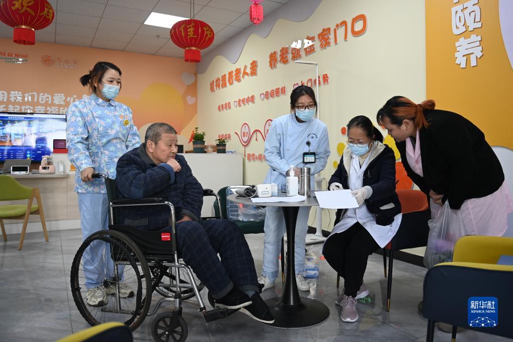 11月19日,在慈溪市白沙路街道居家養老服務(wù)中心,81歲老人吳森泉(左二)在接受免費助浴服務(wù)前進(jìn)行身體狀況檢查。