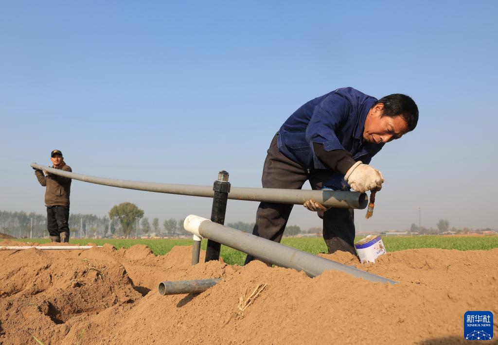 11月20日,工人在河北省晉州市周家莊鄉第七生產(chǎn)隊的麥田里安裝節水灌溉管道。