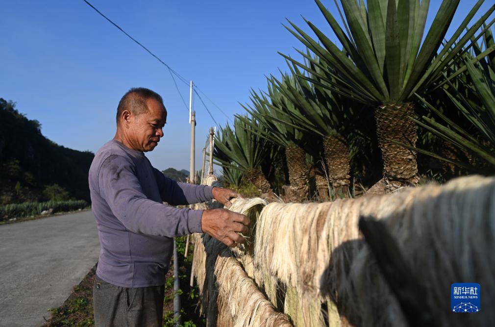 11月20日,在廣西平果市舊城鎮康馬村,一名村民在晾曬劍麻。
