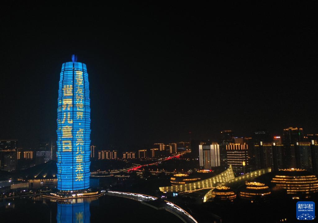 11月20日,鄭州市千璽廣場(chǎng)主樓為世界兒童日亮燈(無(wú)人機照片)。