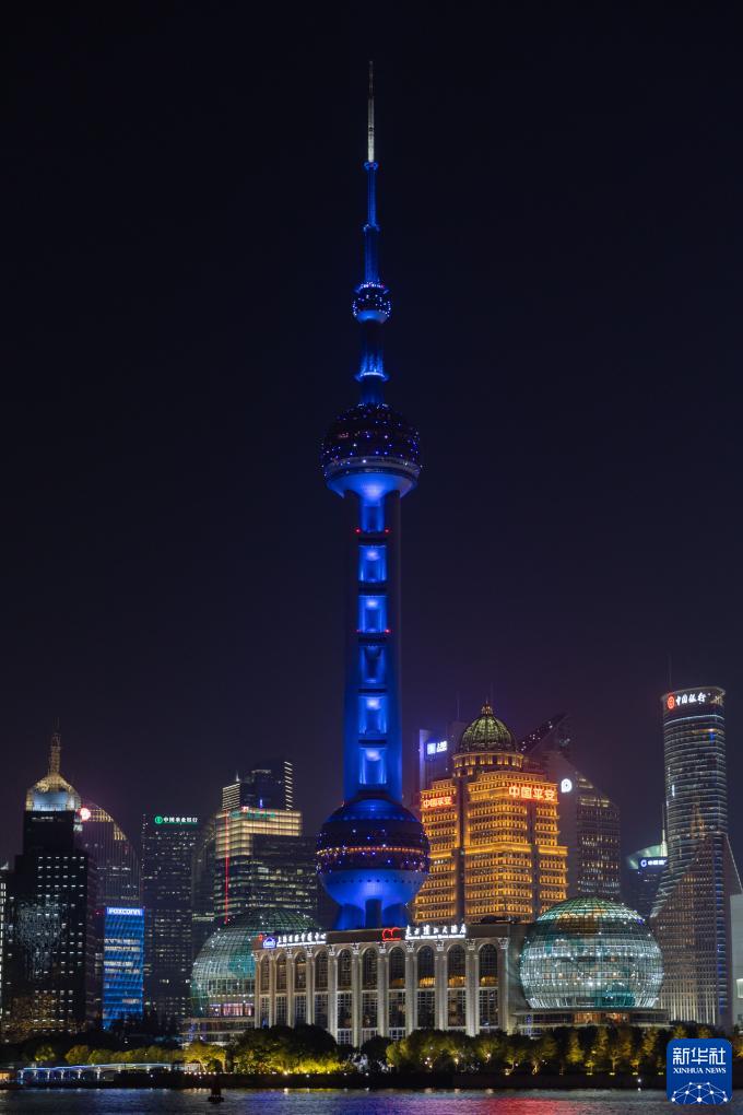 11月20日,上海陸家嘴地標建筑為世界兒童日亮燈。