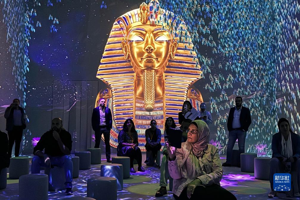 當日,圖坦卡蒙沉浸式展覽在大埃及博物館開(kāi)幕。觀(guān)眾可通過(guò)現場(chǎng)絢麗的視覺(jué)效果和配樂(lè )沉浸式了解法老圖坦卡蒙的故事,以及古埃及的歷史文化。