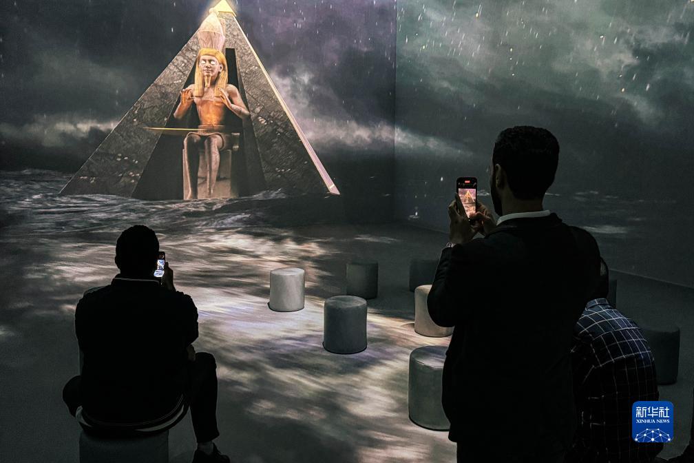 當日,圖坦卡蒙沉浸式展覽在大埃及博物館開(kāi)幕。觀(guān)眾可通過(guò)現場(chǎng)絢麗的視覺(jué)效果和配樂(lè )沉浸式了解法老圖坦卡蒙的故事,以及古埃及的歷史文化。