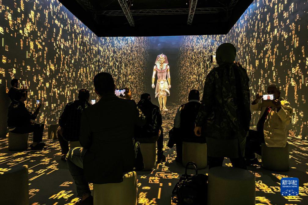 當日,圖坦卡蒙沉浸式展覽在大埃及博物館開(kāi)幕。觀(guān)眾可通過(guò)現場(chǎng)絢麗的視覺(jué)效果和配樂(lè )沉浸式了解法老圖坦卡蒙的故事,以及古埃及的歷史文化。