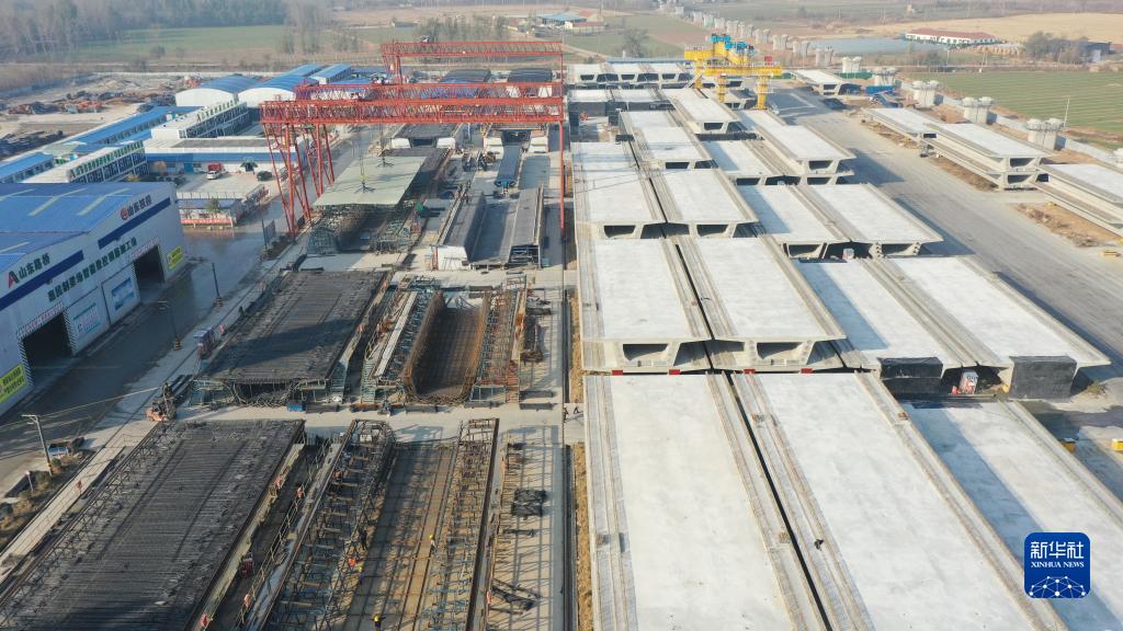 11月21日拍攝的濟濱高鐵山東路橋集團惠民制梁場(chǎng)箱梁加工現場(chǎng)(無(wú)人機照片)。